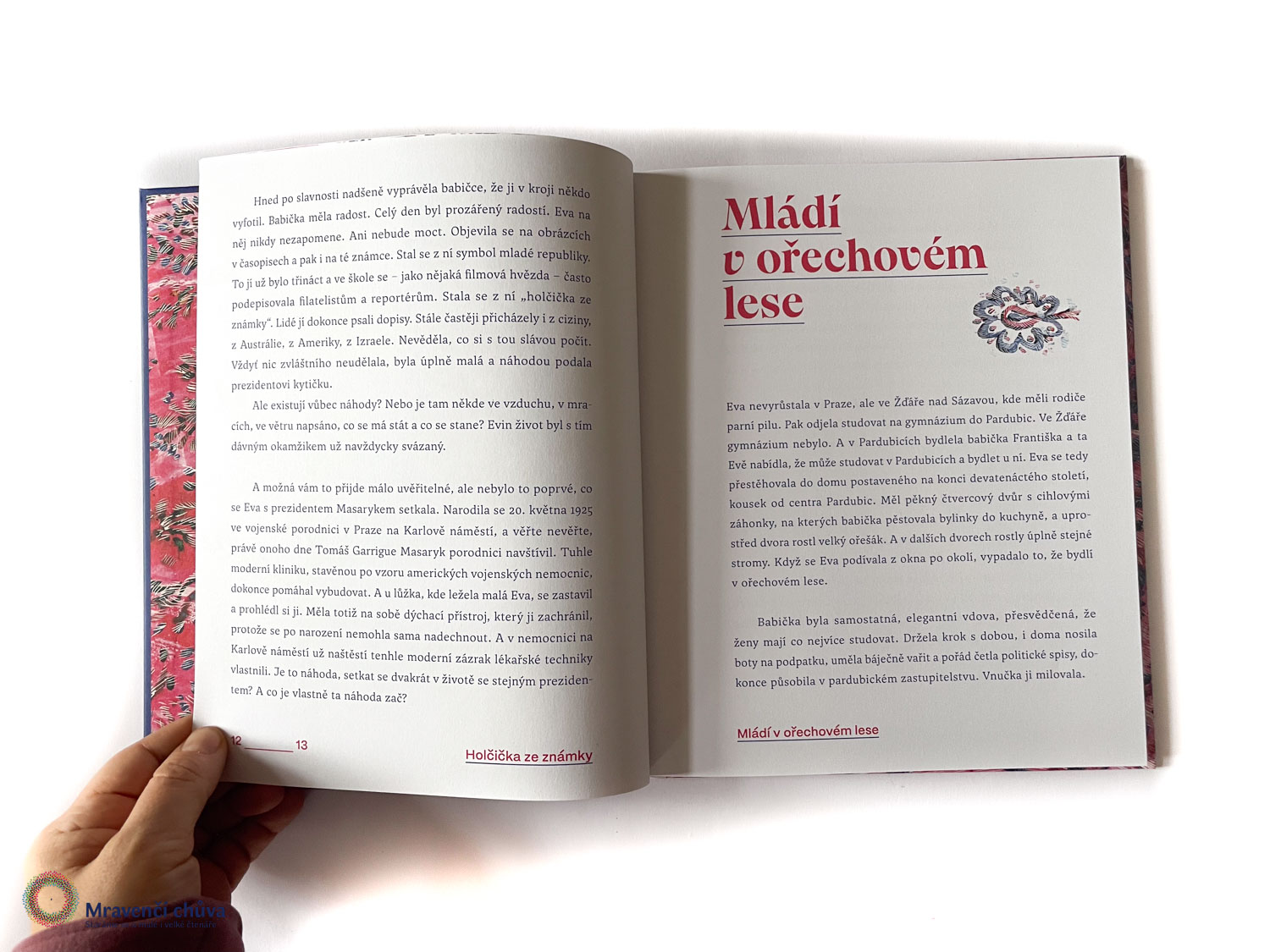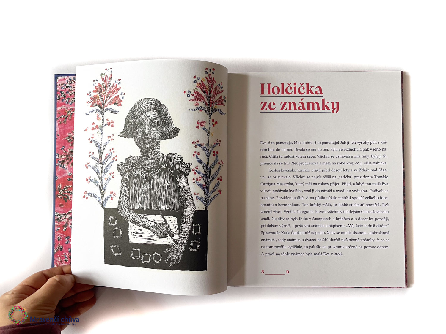 Příběh Evy Haňkové, která se díky fotografii s prezidentem Tomášem Garriguem Masarykem z roku 1928 stala součástí slavné československé poštovní známky, symbolu období první republiky. Prostřednictvím příběhu „holčičky ze známky“ můžeme sledovat průběh 20. století očima dívky, která se narodila ve svobodném Československu, dospívala během druhé světové války, zažila dvě diktatury a poté v roce 1950 emigrovala nejprve do Německa a později do Ameriky. Čteme o jejích náročných začátcích v nové zemi, kde se Eva spolu se svým manželem snažila vybudovat nový domov, a také o její snaze zachovat si českou kulturu, jazyk a pečovat o své kořeny. Kniha zachycuje naději na nový svobodný život, touhu nevzdávat se i těžkosti, které přináší emigrace a život v zemi, jež je tolik vzdálená místu, kde jste se cítili doma. Kniha přibližuje nejen historické události a proměny společnosti v průběhu 20. století, ale je také osobním sdílením myšlenek, obav i nadějí jedné ženy. Příběh vypráví spisovatelka Markéta Pilátová a svým originálním stylem jej ilustruje Renáta Fučíková.