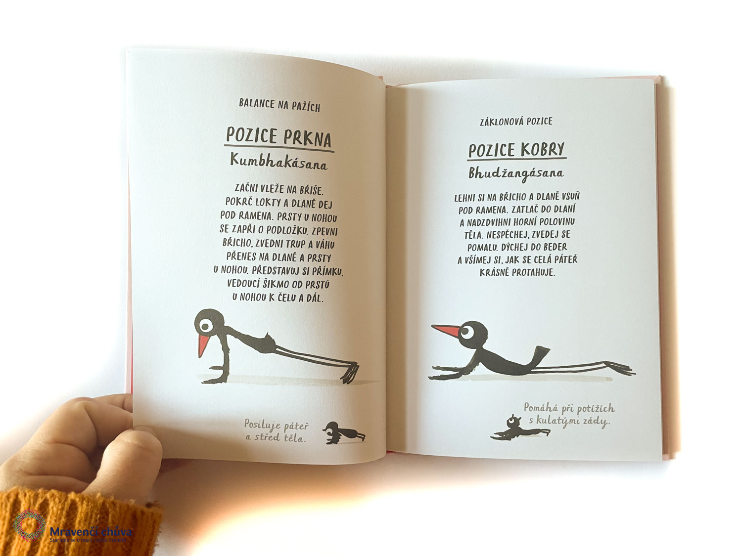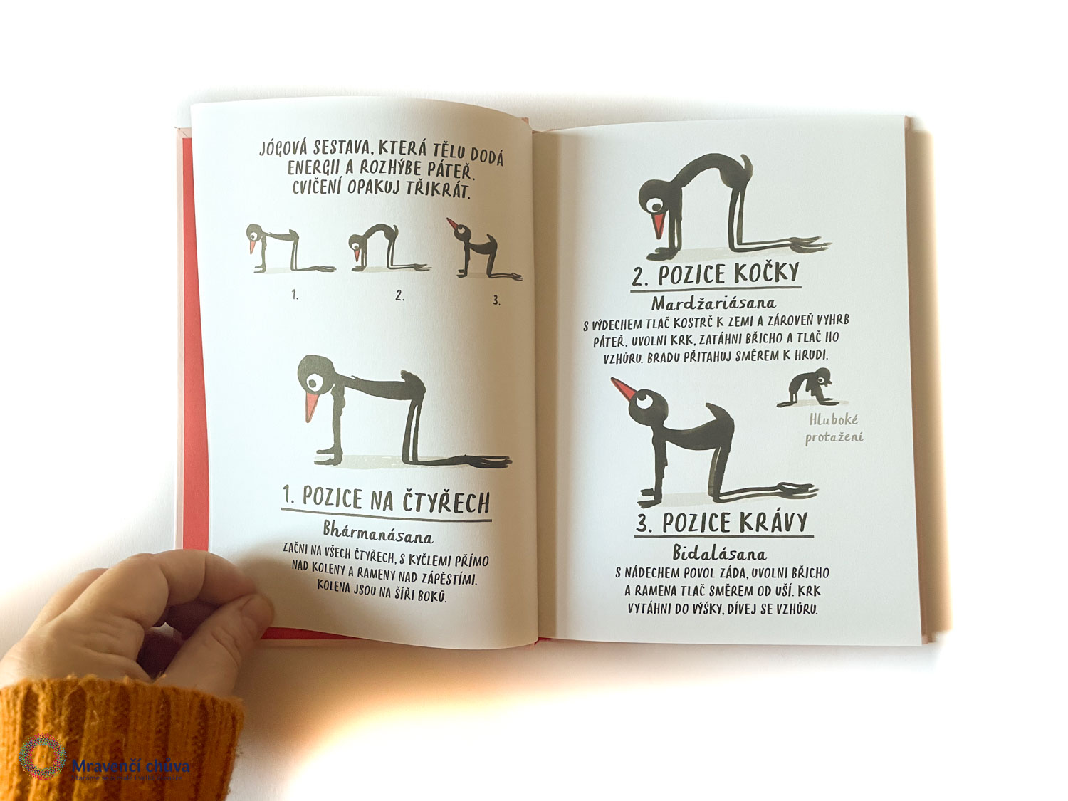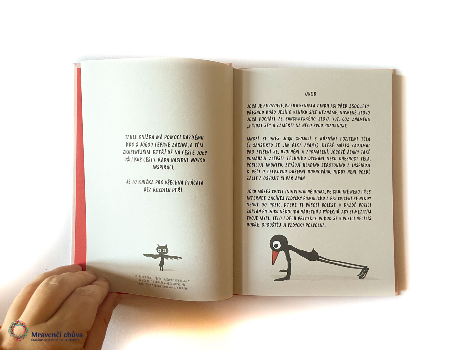 Útlá kniha Marion Deuchars se věnuje józe, konkrétně takzvaným jógovým ásanám neboli pozicím. Obsahuje krátký úvod, zbytkem knihy provází hravý pták, podle kterého je možné jednotlivé ásany provádět. Kromě ilustrací najdeme u každé pozice i stručný popis, jak ji správně cvičit. Knihu doporučujeme všem dětem, které se rády hýbou, zkoušejí nové věci nebo už mají s jógou zkušenost a chtějí v ní pokračovat. Z pohledu čtenářství může být přínosná tím, že propojuje dva zdánlivě odlišné světy a přitahuje pozornost průvodcem, který vyvolá úsměv na tváři.