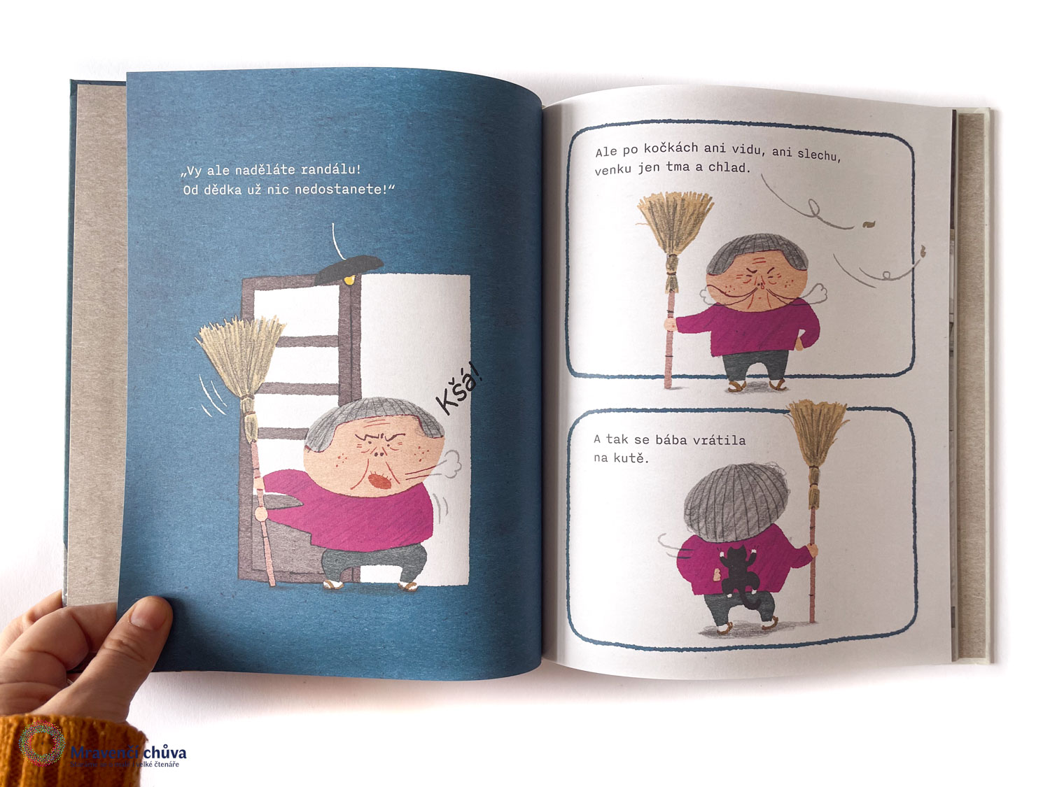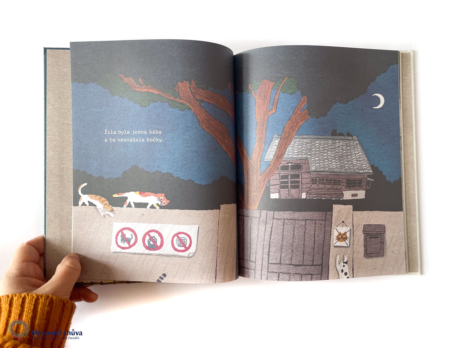 Ve starém domě s plechovou střechou žije stará bába, která nesnáší kočky. Jenže okolní toulavé kočky se jí vytrvale vkrádají do domu, zabydlují se a s přibývajícími stránkami přebírají stále víc z jejích každodenních činností – bába začíná ztrácet paměť a hůře vidí. Čtenářstvo tak sleduje zvláštní rozpor mezi jejím urputným odporem a tichou, samozřejmou přítomností koček. Ve chvíli, kdy zapomene, že je nesnáší, převezmou vládu nad domem docela a pečují o ni právě tak, jak to umí jen ony. Na konci se dozvídáme, odkud se její nenávist vzala. Obrázková kniha citlivě vypráví o samotě, stáří i blízkosti a zaujme nejen silným tématem, ale i výtvarným zpracováním. Malby v sytých barvách se střídají s jemně kreslenými komiksovými panely. Rozpitá linka, práce s emocemi i hravé detaily – skryté předměty a maskované kočky – potěší nejen dětské čtenářstvo. Kniha byla nominována na Golden Tripod Award i Feng Zikai Award a zařazena do katalogu White Ravens.