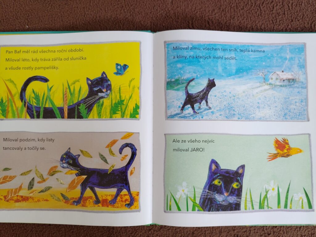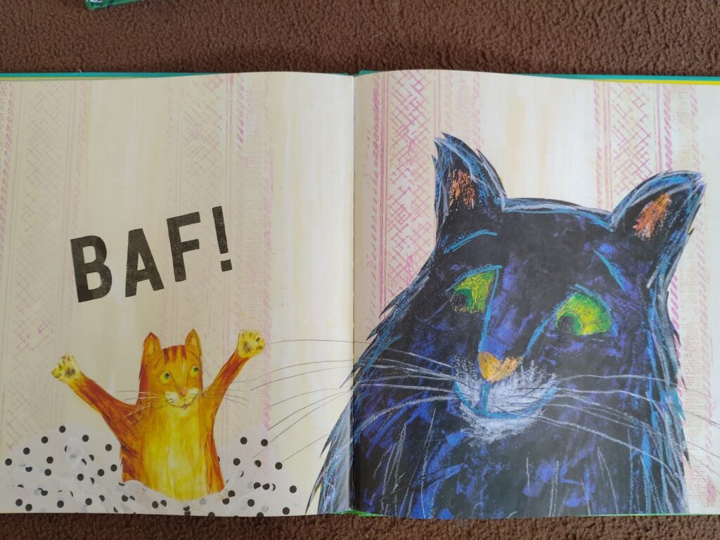 Zaujaly mě hlavně ilustrace – třeba to, že na začátku knížky je namalovaný jen jeden kočičí ocásek, ale na konci už jsou dva. To znamená, že Baf byl napřed sám, ale potom už ne.