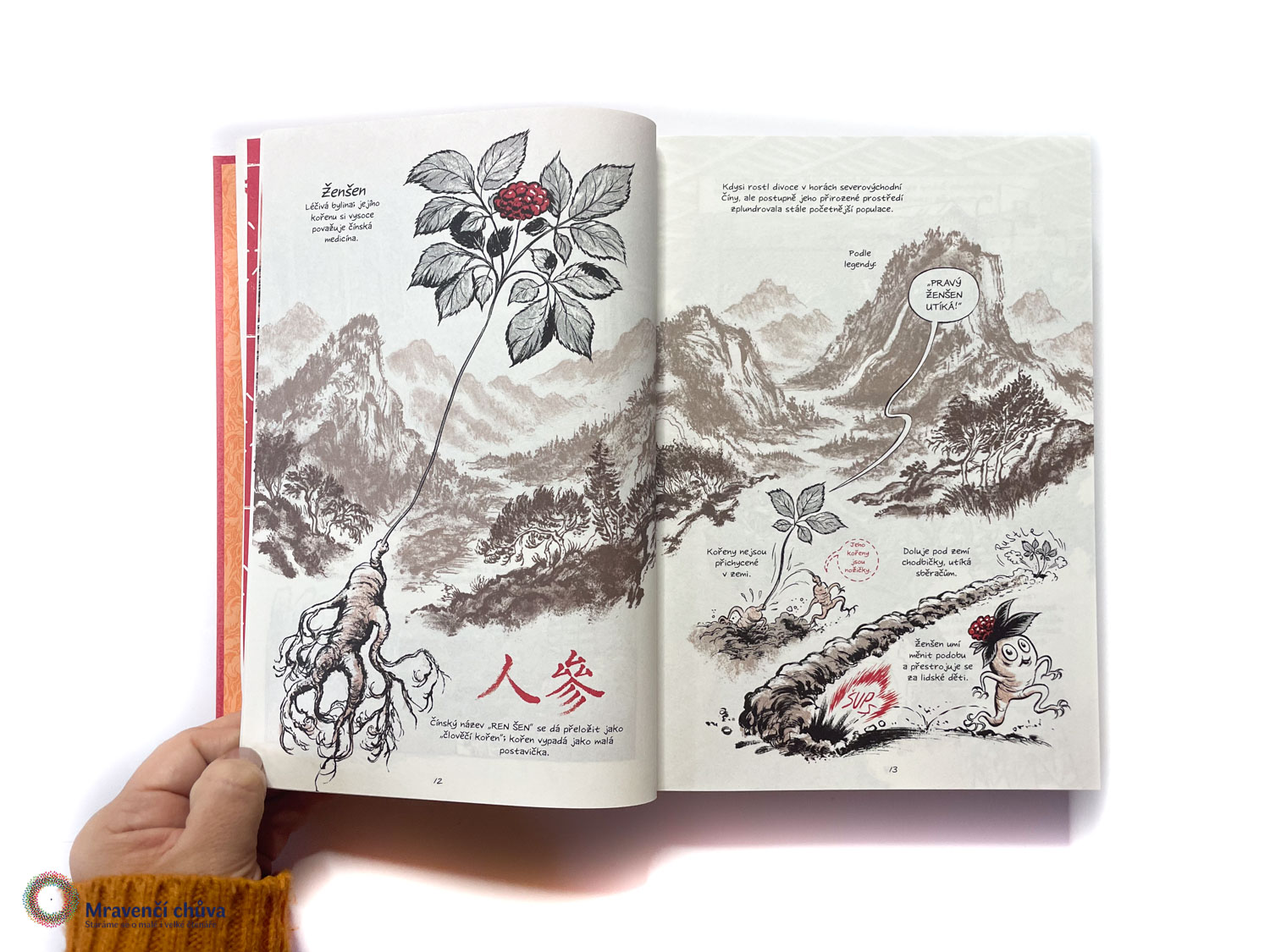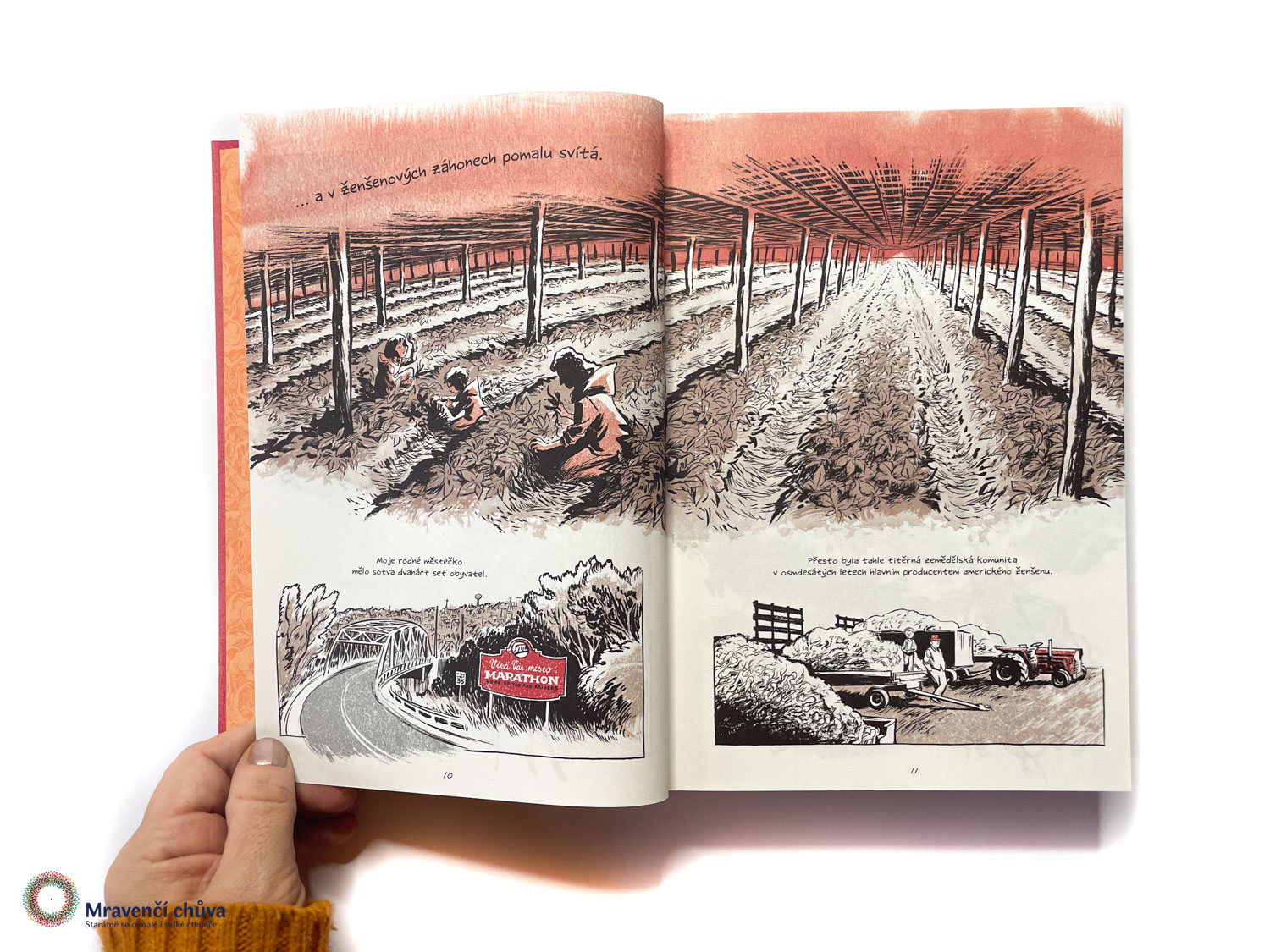 Dokumentární a autobiografický komiks volně navazuje na úspěšnou a oceňovanou knihu Pod dekou. Sledujeme autorovo dětství na ženšenové farmě, kde byla jeho hlavní motivací k práci – kromě pomoci rodině – možnost vydělávat si na komiksy. Vrací se do zemědělského Wisconsinu, konkrétně do města Marathon, kde jako dítě pracoval na poli s ženšenem. Oproti knize Pod dekou, v níž své křesťansky bigotní rodiče vykreslil spíše nelichotivě, jsou Ženšenové kořeny v tomto ohledu smířlivější. Výrazně se tu objevuje téma zrání v dospělosti, zároveň je ale velmi intenzivně přítomná Thompsonova nejistota. Prochází tvůrčí krizí a klade si řadu otázek, které můžeme v komiksu sledovat. Důležitou roli hrají vztahy se sourozenci – bratrem a sestrou –, s nimiž sdílí společnou zkušenost dětství i rozdílné způsoby, jak se k rodinné minulosti vztahovat. Vydává se dokumentovat příběhy lidí, kteří zasvětili ženšenu nemalou část svých životů, a to nejen ve Wisconsinu, ale také v Asii, kam cestuje společně se svým bratrem. Thompson tematizuje i ekologický rozměr pěstování – ženšen zabírá velké množství půdy, nelze ho pěstovat opakovaně na stejném místě a jeho produkce je spojená s masivním využíváním pesticidů. K těmto lidem je ale autor chápavý a ukazuje, že pokud chtěli v pěstování pokračovat, často neměli jinou možnost. V průběhu čtení se dozvídáme další informace o ženšenu – o obchodování, historii i politických vazbách USA a Asie v tomto kontextu. To vše se propojuje ještě na osobní rovině: do autorova života vstupuje autoimunitní onemocnění, které oslabuje jeho ruce a ohrožuje jeho tvorbu, přičemž jednou z nabízených forem léčby je vedle klasické medicíny i ženšen. Thompson kreslí ručně, což dává kresbě živost, křehkost i jemnost, pracuje pouze s černým a červeným inkoustem, případně jejich kombinací, a bílou jako podkladovou barvou. Ženšen často ztvárňuje antropomorfně a funguje zde také jako metafora pro prokopávání se vlastní minulostí. Důležitou vlastností knihy je i její rozsah – má přes 440 stran, což umožňuje hluboké ponoření jak do tématu ženšenu, tak do autorovy mysli a navázání intimnějšího vztahu s vypravěčem.